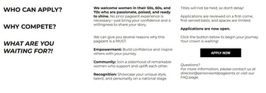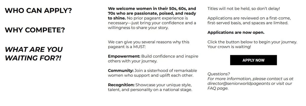 Women are crowned in the categories of 50s, 60s, and 70s, and are welcomed from all over the world. There is no talent category in our pageant. Stateside or international, we welcome you all with open arms.